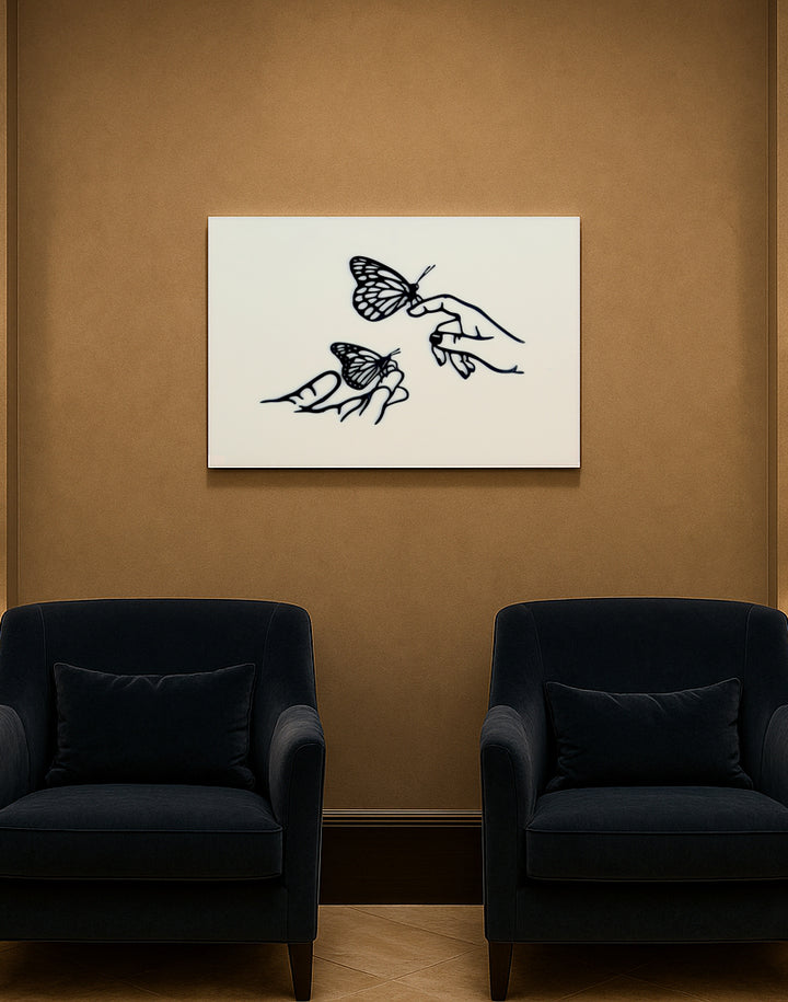 A tribute to change, grace, and emotional freedom, Let Them Fly captures a moment where two hands meet butterflies — one offering, the other releasing. The minimalist line art balances stillness with motion, symbolizing transformation, hope, and the beauty of letting go with trust.