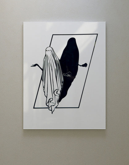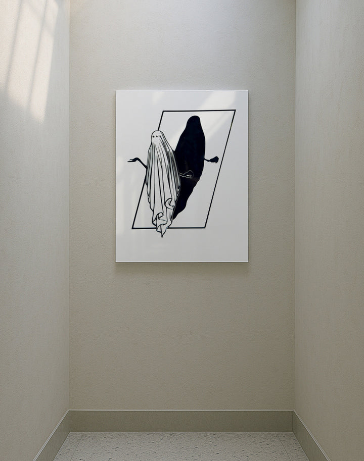 Playful on the surface, profound at its core — Veil & Void invites the viewer to reflect on the contrast between appearance and essence. A draped ghost figure, arms delicately poised, is met by a shadowy feminine silhouette — both enclosed within a distorted frame. The artwork bridges light-hearted symbolism with subtle existential depth, blending humor, identity, and surrealism.